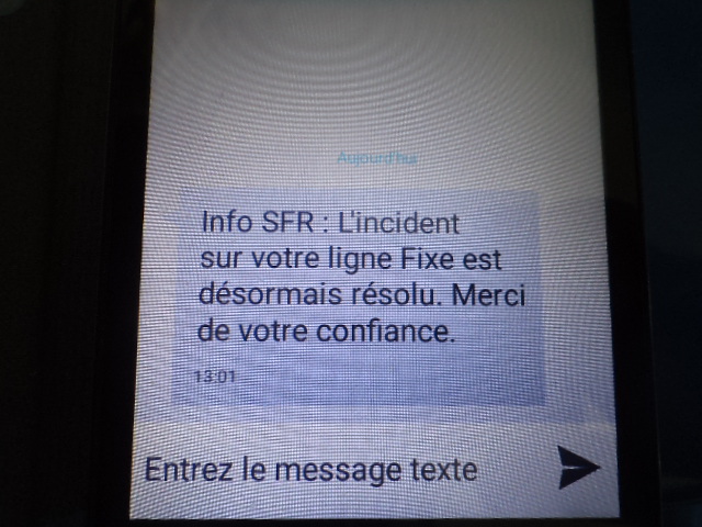 Mensonge offre promotionnelle fibre suite appel dans Offres Box 16102021 Réponse certifiée par SFR. Pas dinternet via la fibre sur ma box Pas de réseau sur mon téléphone Le tout en même temps cest une panne locale ou général mais cest la 2ème fois que ça arrive et pas dinformation ou dexcuse de la part de SFR pour la gène occasionnée. Si vous rencontrez un problème avec SFR et que votre emplacement nest pas répertorié veuillez soumettre un rapport ci.